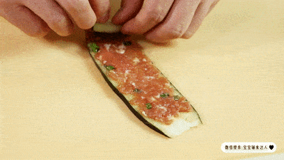 从一头把茄子片小心的卷起来,这里你们可以卷得慢一些,但最好能紧实一点,别太松了,要不容易影响口感。