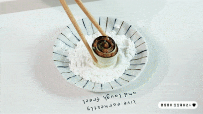 卷好的茄子肉卷在表面均匀地裹上淀粉,这样不仅表面会多点酥脆感,也能防止肉卷松散。