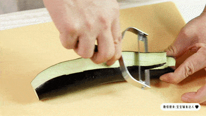 相比用菜刀切片,我更建议你们用这种刮片刀来给茄子削片,薄厚均匀,也不用担心中间切断了,成功率更高。