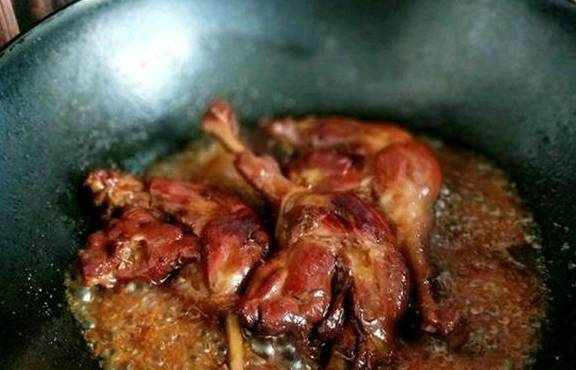 3、加入备好的鸭腿儿翻炒上色。