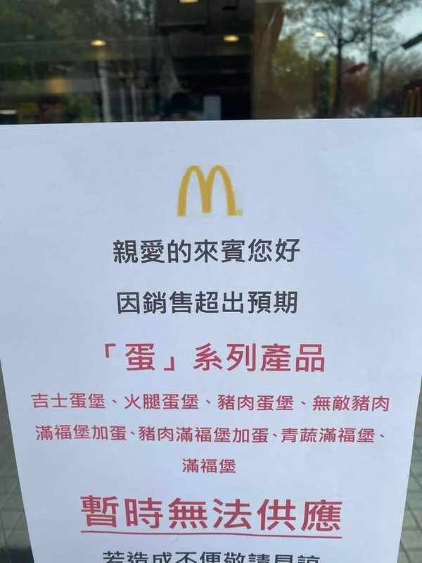 台北部分麦当劳已贴出“蛋系列产品暂时无法供应”的告示;