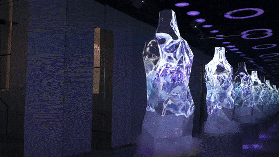 走入全镜面式空间,当泸字出现在酒瓶雕塑的正中间,关于泸酒的篇章便缓缓掀开。11台高流明超清投影机+4台主机串联成的本地客户端支撑起整个空间的光影效果。镜面上的水幕静静流淌,酒瓶中垂落的清冽甘泉正是醇酒甘甜的来源,底座喷发的水雾增添一丝朦胧,酒与光影的艺术翩翩舞动。
