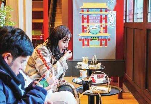 顾客在位于北京大栅栏的内联升“大内·宫保”咖啡厅品尝咖啡茶点。新华社