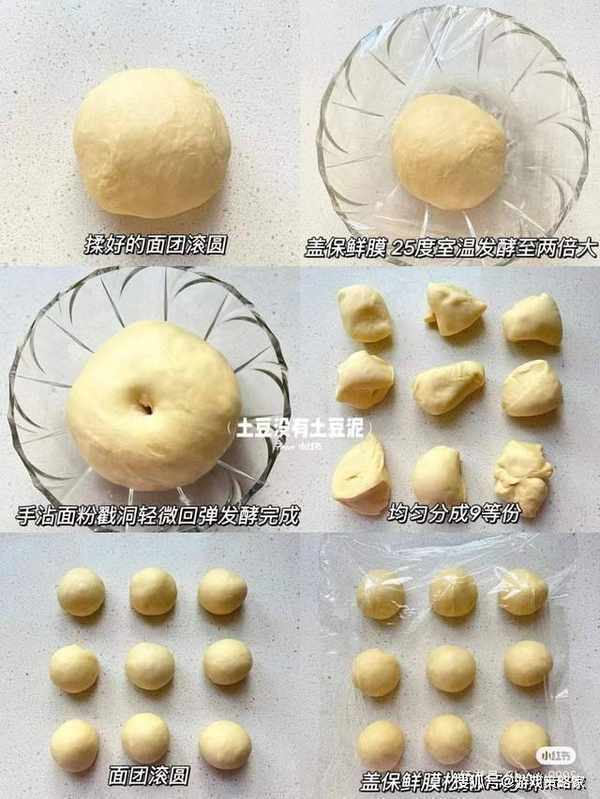 取出面团按压排气,分割成9等份,滚圆醒15分钟