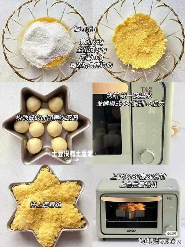 椰蓉馅:黄油35g、全蛋液30g、椰蓉30g、糖20g