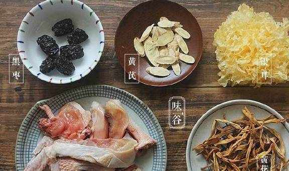【材料】:鸡肉小半只、银耳12克、黄芪10克、黄花菜15克、黑枣4颗、姜2片、盐适量
