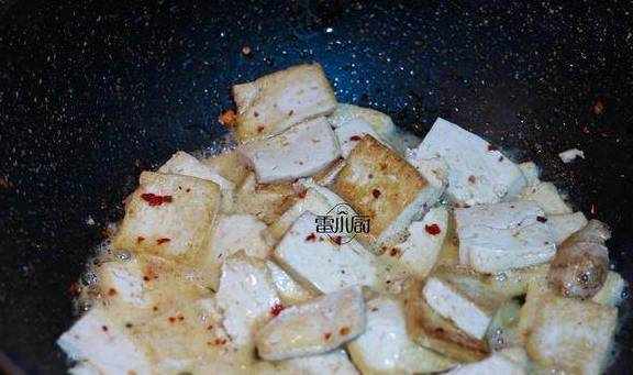 4、放入豆腐,食盐,煎至两面上色后,再撒点干辣椒面带点辣味好吃,不能吃辣就不要放了。