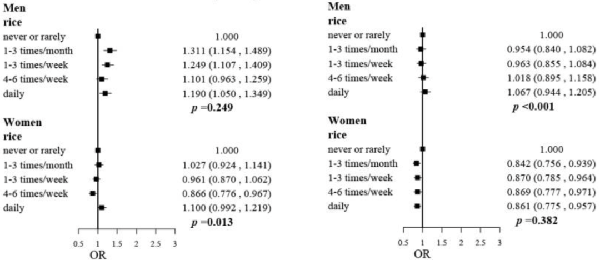 数据显示,在这部分BMI正常的参与者中,每天都吃面食的男性出现全身肥胖风险是<1次/周的2.25倍!此外,与面食爱好者相比,爱吃米饭的男性出现全身及中心性肥胖的风险分别降低42.9%和22.2%,女性分别降低14.9%和23.1%。