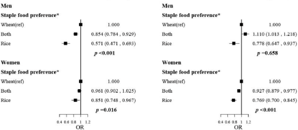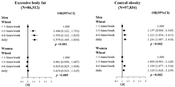 结果显示:小麦摄入量越高,男性发生全身肥胖以及中心肥胖的风险更大,而女性发生中心肥胖的风险同样上升;但在“干饭爱好群体”中并未观察到类似的趋势。
