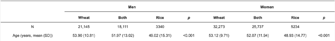 另外,主食偏好类别的制定依据是:大米和小麦的每周摄入频率——每天都吃米饭或每周吃4-6次,但吃面食的次数<4-6次/周,即为米饭爱好者;相反,每天都吃面食或每周吃4-6次,但吃米饭的次数<4-6次/周,即为面食爱好者;其余参与者有着相似的食用大米和小麦频率。