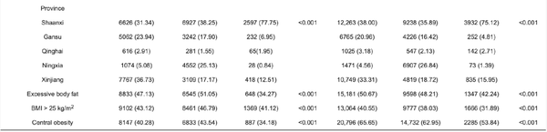 研究者在基于西北五省的前瞻性队列中收集到105,840名参与者的数据,基础信息包括:人口特征、生活方式以及病史。肥胖相关的数值包括:体重、体脂率(BFP)、身体质量指数(BMI)以及腰围(WC);其中,男性BFP>25%和女性BFP>35%被定义为全身肥胖;男性WC≥90厘米和女性≥80厘米被定义为腹型肥胖。