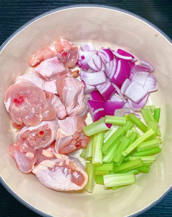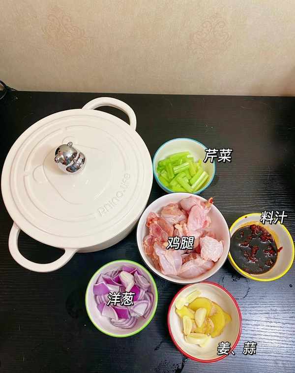 首先我们来准备食材,姜蒜、鸡腿、洋葱、芹菜、小米椒等,该采摘洗净的洗净,该切备的准备好!