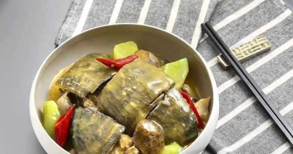 1、甲鱼洗净,放入沸水锅中,盖上锅盖焖2分钟,捞出。用小刀刮去乌龟身上的黑皮,剪掉尾巴和爪子上的趾甲。然后用刀沿甲壳划开裙边,剥去甲壳,取出内脏和腹部脂肪,清水洗净,切成约50厘米长的块。3厘米见方。