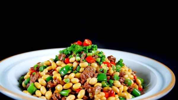 1、黄牛肉洗净切丁,加入普丁、蒜、盐、料酒、鸡精、味精、水淀粉调味10分钟。另外,事先将晒干的黄豆用热水泡好,放入沸水锅中煮熟,捞出沥干水分。