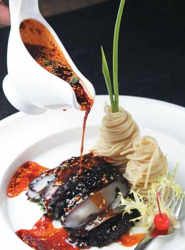 2、上桌时将姜、蒜、葱、芝麻酱、芥末酱、盐、糖、生抽、香醋、味精、红油调成酱汁,盛入容器中,与海参片一起食用上盘一起上桌,在客人面前淋上酱汁,翻上皮毛。