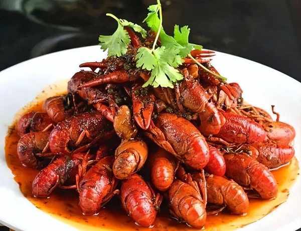 3.准备菜肴:锅内烧热色拉油,加入蒜瓣、姜片爆香,加入干辣椒、干香灰调味。加入炸好的小龙虾,啤酒同鲜汤一起煮沸,加入小龙虾底料400克、辣椒粉、白糖、鸡精、味精、胡椒粉,盖上锅盖煮约50分钟。3分钟,加入五香粉煮15分钟继续煮绿豆和葱结1分钟。起锅装盘,撒上香菜节。