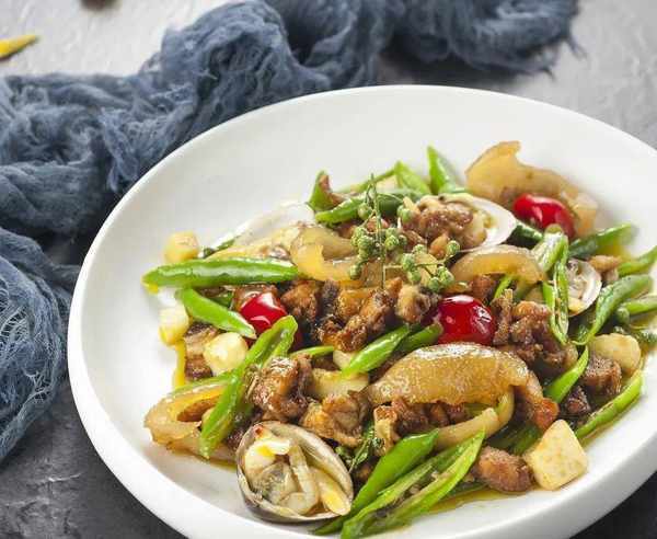 2.在干净的锅里烧热植物油,等油温达到50%热时,放入入味的鸡块炒香,然后加入姜、蒜、泡椒、西洋菜和青椒炒香,然后将海参去皮切片,再加入辣椒粒炒至生鲜入味,最后倒入香油起锅。关键:鸡肉炒的时候一定不能太干,否则味道会干,最后加的辣椒一定要炒到生。