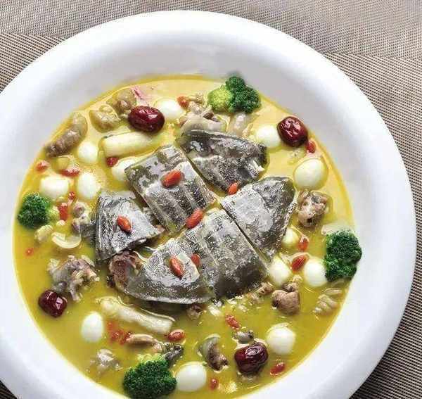 原料:大甲鱼1500克,去皮铁棒1根,山药段200克,鹌鹑蛋200克,火腿200克,泡好的枸杞30克,鸡油10克,菜籽油50克,100西兰花、大枣、姜、葱、盐、胡椒粉、糖、鸡精少许