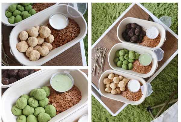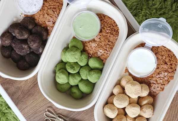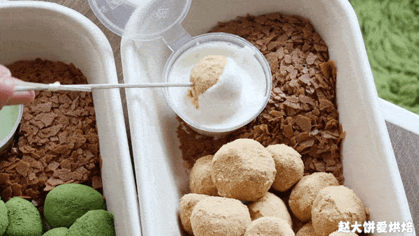 6.拌匀,将不同口味的麻糬放入盒中,放入酥片,放上芝士奶盖酱即可。