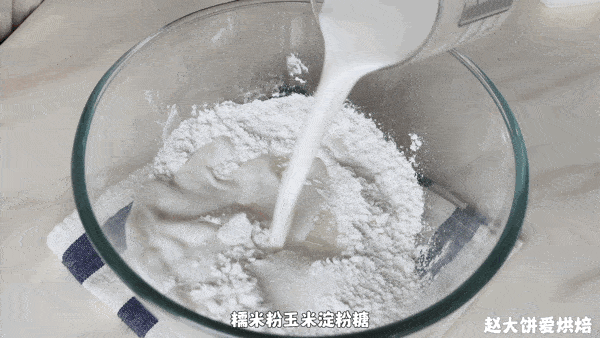 1.将糯米粉、生粉、糖、糖浆和牛奶混合制成糯米麻糬,拌匀后过筛。