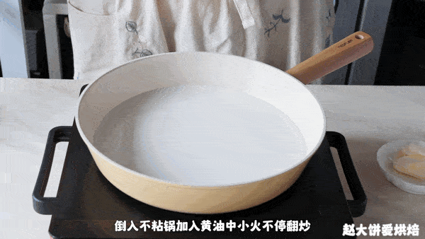 2.倒入不粘锅,加入黄油,不断搅拌加热