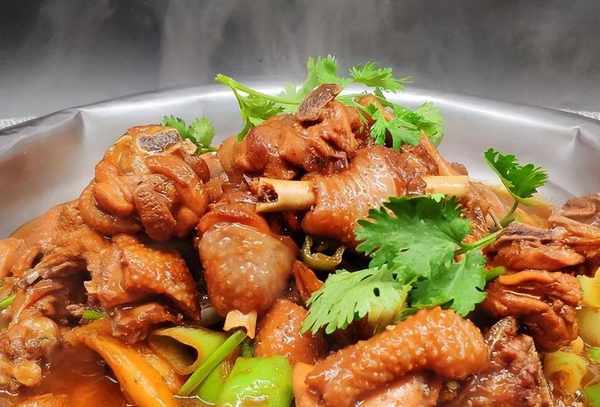 黑爪公鸡剁大块,不用焯水,洗净,检查水分,锅烧热加少许油,姜片、八角、花椒炒香,将鸡块下锅然后把鸡块放在高温下。翻炒三分钟,出油香味后,加入甜面酱、豆瓣酱、生抽和一勺老抽。