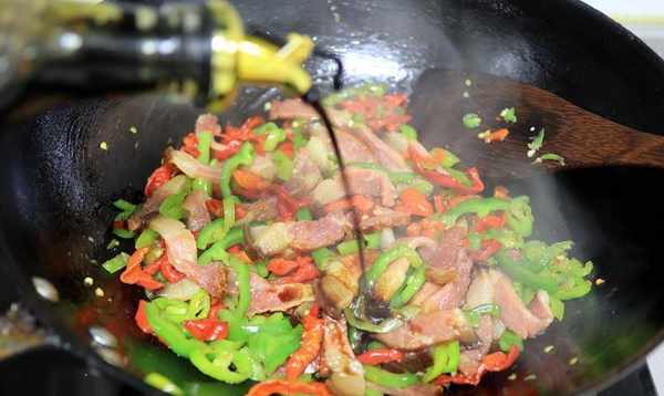 第二步,开火烧锅,将培根放入锅中炒出肥肉,然后将准备好的胡萝卜片放入锅中翻炒约两三分钟,即可辣椒切碎,葱切碎,蒜切碎,油炸后加少许鸡精提味,加少许生抽提鲜。