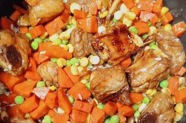 配料:排骨两根切块,胡萝卜半个切丁,甜豆和玉米粒少许