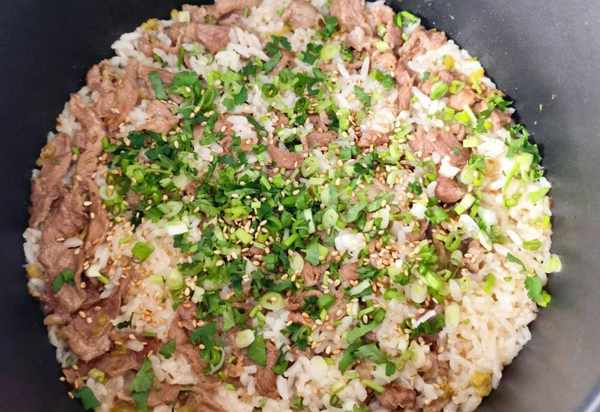 2.少油炒熟羊肉盛出备用,另起锅放洋葱(忘买了)炒香,下羊肉和孜然碎翻炒;放酱油、蚝油、盐糖翻炒,米淘洗干净将羊肉铺上;加正常煮饭的水,煮饭键坐等即可,出锅时放香菜、香葱碎和芝麻搅拌均匀
