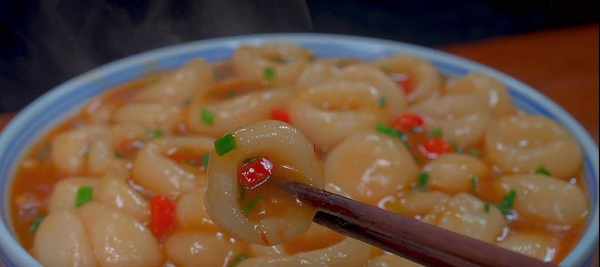 7.再次煮沸后,放入准备好的萝卜面团,用勺子一个一个的舀成球状,放入锅中,小火慢慢煮至半熟,然后加入海鲜蘑菇继续煮,加入切碎的青菜洋葱再加入少许香油煮至美味的萝卜汤就做好了。