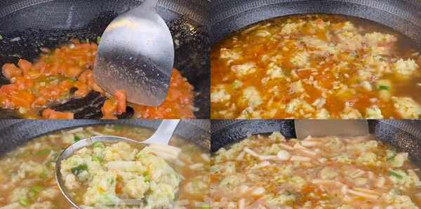 6.锅中油烧热,放入葱花和姜丝翻炒片刻,再放入西红柿炒片刻用小火慢炒至西红柿软烂,再放入一些开水继续大火煮,然后加入盐、鸡精、胡椒粉、生抽、生抽调味
