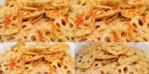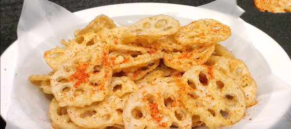 5、莲藕片炸至焦黄酥脆时,即可直接食用。您也可以撒上您最喜欢的粉末并添加一些辣椒以进行良好的混合。美味藕夹就这样。