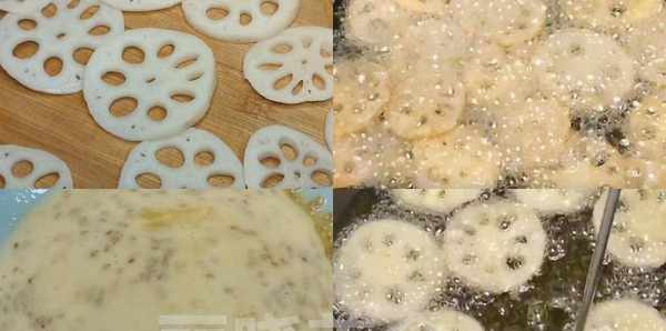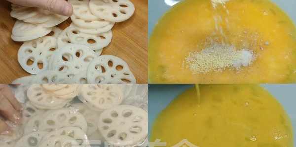4、锅中油烧热至40%热,然后将莲藕放入打好的蛋液中,再裹上蛋液,再放入油锅中用小火慢慢煎至凝固。转动它,使其受热均匀