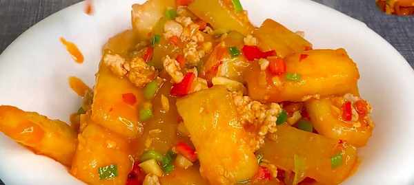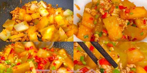7.炒出味后,加入蒸好的冬瓜继续炒至入味,然后加入调好的酱汁,再加入剁碎的花椒翻炒片刻,翻炒入味即可食用炒冬瓜。准备好了。