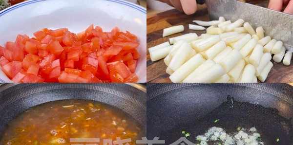 6、锅里放油烧热,放入切好的西红柿翻炒片刻。用小火慢慢煎,不断搅拌。加少许盐让番茄汁快速炒熟,然后加入葱、姜、蒜和胡椒粉继续炒。炒,不断搅拌,直到入味,然后加入少许开水