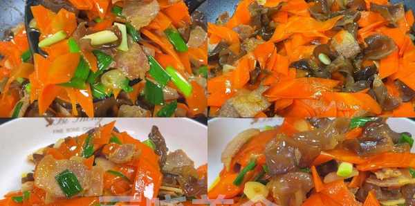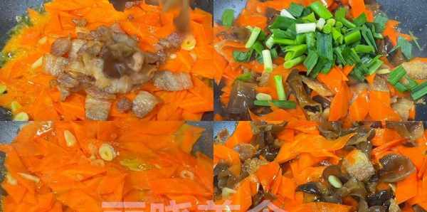 7.炒到入味时,加入准备好的萝卜片,继续炒,然后加入香菇,调味,加入盐,鸡精,蚝油,生抽,老抽,胡椒粉,继续炒一会然后加入蒜苗,炒出香味,然后上美味的炸萝卜片就完成了。