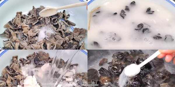 5、接下来,准备好香菇,放入碗中,然后加入一些小苏打,加入一些白糖,再倒入温水,可以加快香菇的泡发速度。海绵泡好后,加入温水,再加入少许面粉,洗净后,把水变淡,切断新鲜感,然后取出放在一边待用
