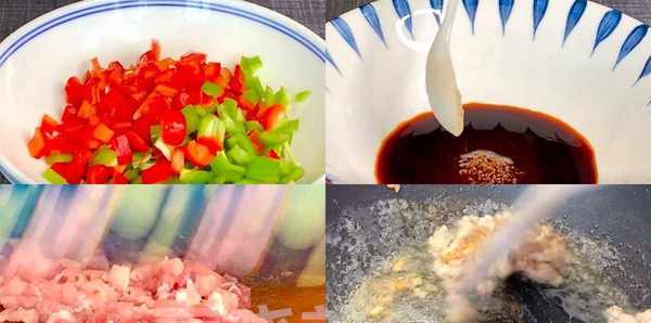 3.准备一些红辣椒,然后准备一些青辣椒。先将辣椒洗净,然后去籽去蒂,再将辣椒切丁。准备一些大蒜,剁成蒜末,然后准备一些小葱,剁成葱花,准备一些姜,剁成姜末,盛入碗中待用。