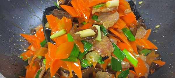 6、锅里放油烧热,放入肉片翻炒,小火慢炒,把里面的油炸透,继续炒至微黄,下葱姜蒜继续翻炒炒。