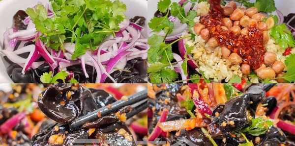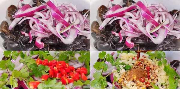 5、接下来开始调味,加入盐、鸡精、蚝油、酱油、香醋、蚝油、蚝油,加少许糖提鲜,再加入炸好的花生米,拌匀,再拌匀即可食用装盘,美味的凉拌黑菇就做好了。