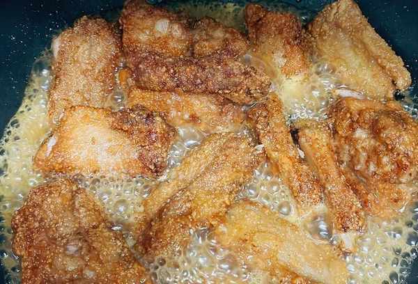 3.开油锅开火,因为我的排骨还是饱满厚实的,所以我在锅里放冷油,这样外面不焦,但是肉不熟。入锅后不要马上翻动,让粉在油浴中凝固后再翻动。炸一会后,用筷子轻轻碰一下。如果觉得皮炸得很硬,说明已经凝固了,可以翻过来。