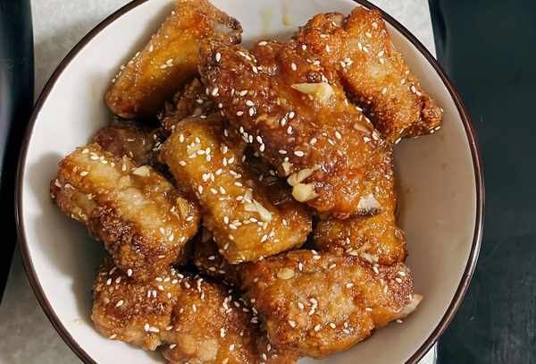 材料:排骨约13根、大蒜5瓣、白芝麻适量(可省略)、榨油400毫升、红薯粉5汤匙
