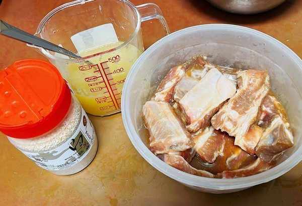 1、将卤汁+排骨提前腌好备用。(最好前一天晚上腌制,实在不行的话至少要腌制3小时。)柳丁6粒+柠檬1个榨汁待用。这次我挤出了大约250cc。也可以在柳丁休赛期直接从超市购买。使用橙汁+柠檬汁。