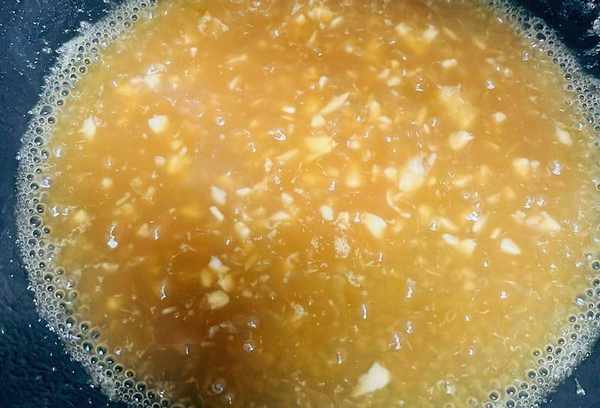 5.排骨放一边,把油倒进碗里,用锅里剩下的少许油把蒜末炒一下。热油溅出来很危险,可以再开一锅。将蒜茸炒香,倒入汁,加1茶匙酱油提色,开锅煮至汁少。