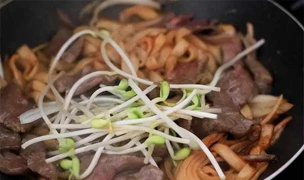 秘诀三:锅铲不要停,不停地翻动锅,将牛肉、米线、豆芽来回煎。因为油少,米粉和牛肉很容易留在锅里。继续搅拌直到所有成分都被分解。生吃时,可以装盘,撒上少量细香葱以增色增味。