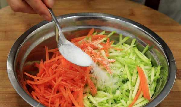 1.首先,准备一个洗净的西葫芦,从中间切开,用勺子挖出果肉,切成薄片,放入锅中;将一半的胡萝卜磨碎,与磨碎的西葫芦一起放入锅中。加入3克盐,先将胡萝卜丝和西葫芦腌好。