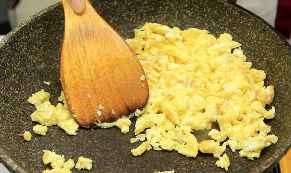3、准备一个小锅,打三个鸡蛋,加1克盐,用木棒快速打散鸡蛋。锅里放油烧热,将鸡蛋倒入烧热的油中煎至鸡蛋成型。用木铲打碎鸡蛋。