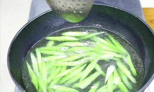 3、锅中烧开水,加入少许盐和植物油,倒入芹菜部分快速焯20秒左右。当芹菜变绿时,立即将其取出并在冷水中快速清洗几下,以保持其清脆的口感。然后将虾也放入水中。