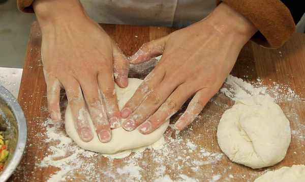 5、面团发酵2小时左右。面团很软。案板上多撒些面粉,将面团挖空切成若干小份,揉搓小份,压成较厚的片状,塞入。西葫芦馅像包子一样包起来,放在砧板上。轻轻按下。