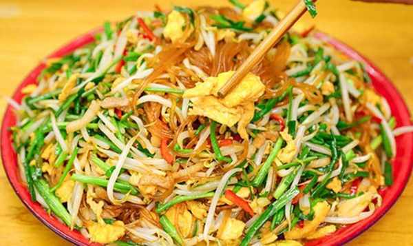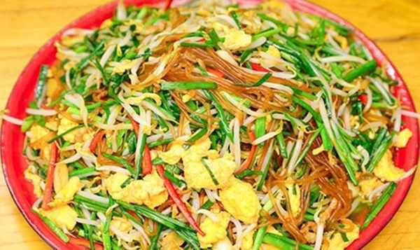 1.一把红薯面条用开水烫软,捞出,加入食用油和酱油拌匀,炸的时候不要粘在一起;将韭菜洗净切段;将红辣椒切成小块以匹配颜色;绿豆芽洗净洗净;打入几个鸡蛋打入碗中,加少许盐调味,搅拌成蛋液;然后切几片五花肉提味。